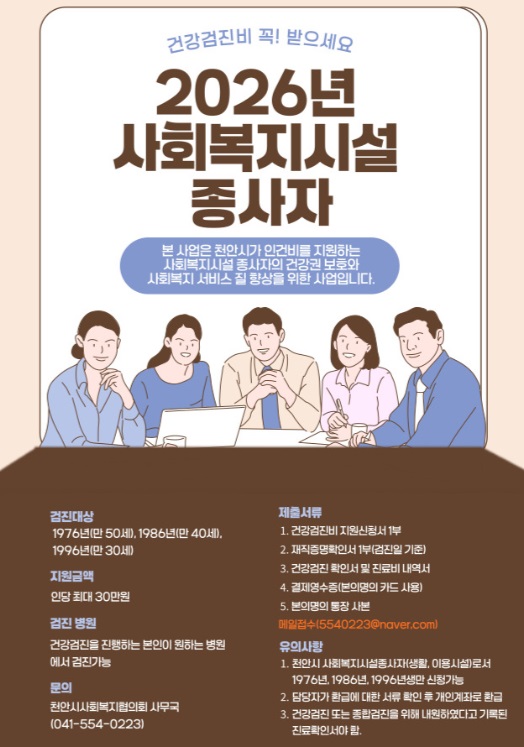 2026년 사회복지시설종사자 건강검진비 지원사업 안내 페이지 정보 작성자작성자 : 천사협 조회조회수 : 212회 작성일작성일 : 26-03-03 15:54 본문 2026년 사회복지시설종사자 건강검진비 지원사업 안내드립니다. 첨부파일 건강검진비 지원 신청서2026년 최신본.hwp (20.5K) 16회 다운로드 목록 다음글2026년 예산서 공고 25.12.31